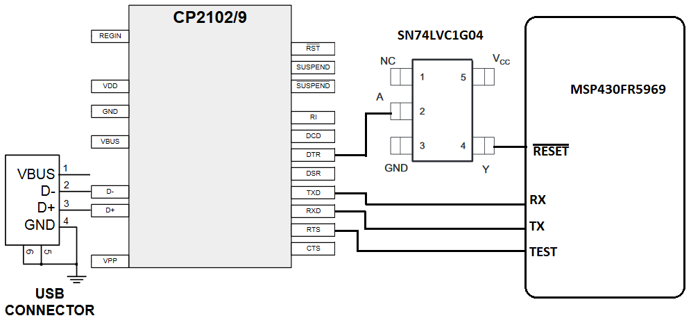 Q2. Is connection of DTR (of CP2102) needs to inverted and then connected to RESET of MSP430FR5969?