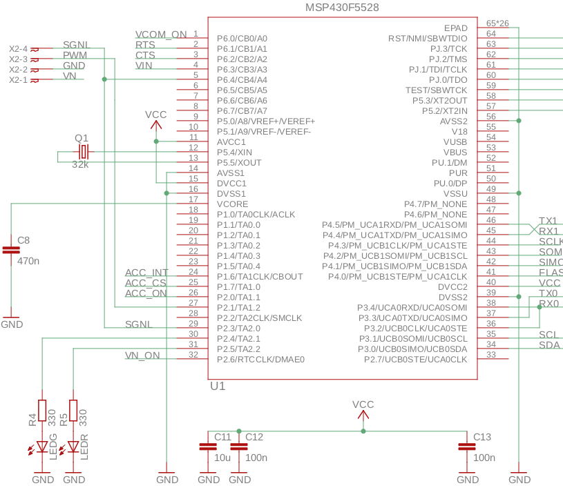 Some time ago I built a prototype (say prototype No 1) of a simple, straight forward, system built around a MSP430F5528 (schematics below), this prototype worked at once and I have so far not found any issues.