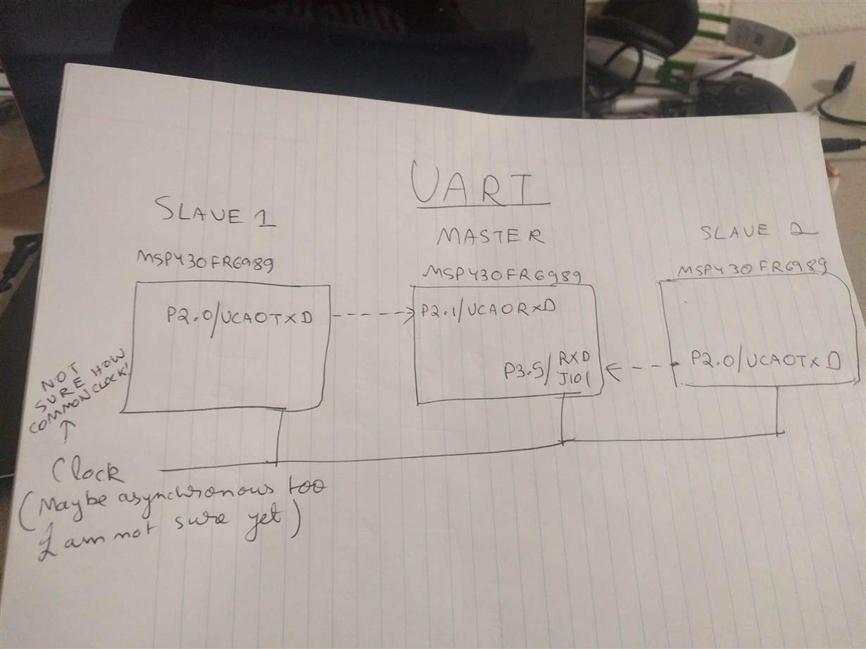 Secondly, is there a good example somewhere on how to set up UART communication in assembler (CCS) between two MSP430s (or one master MSP430 with two slave MSP430s). The example(s) I found in TI Resource Explorer is/are apparently transmitting data to itself and most of the examples online are from MCU to PC.