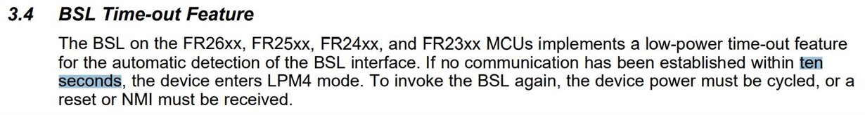 l use ti MSP430FR2311 in my robot application I press the button and the program enters BSL. If I upgrade the program immediately, it will be successful.But if after entering BSL for a while, about ten seconds,