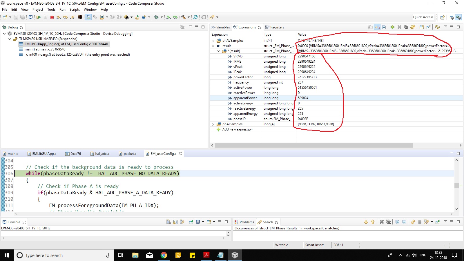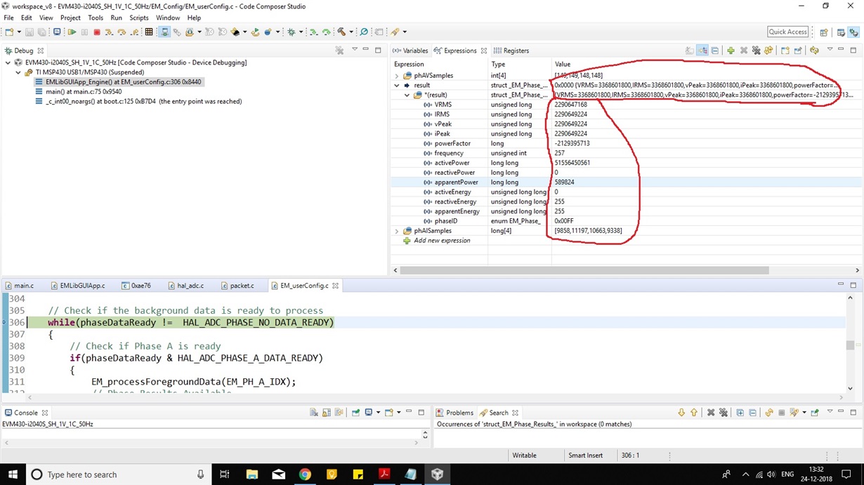 Got code from Energy Measurement design center GUI and flashed to MSP430I2040 but while debugging i am getting different values as shown below-