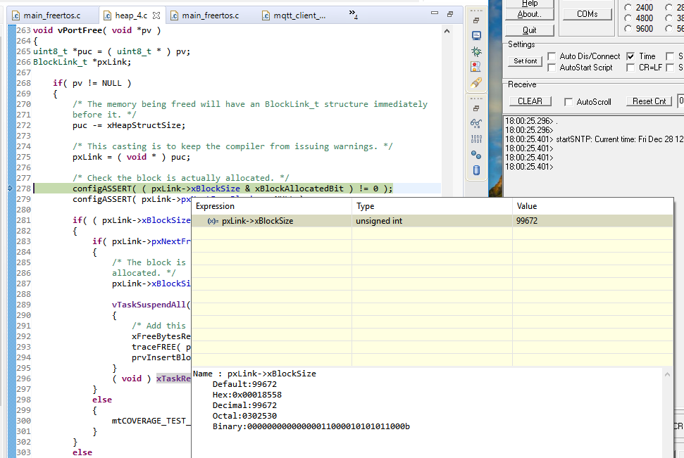 I am using MEP-EXP432E401Y. I am trying to connect secure mqtt with "test.mosquitto.org". I am using mqtt client freertos code form SDK. I follow the instruction from readme for adding secure file. I add that file data in certificate.h file. But my code is stuck in vPortFree when MQTTclient_connection call.