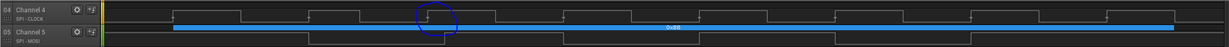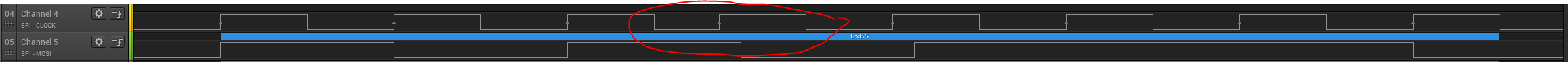 I'm trying to use UCA1 SPI to communicate the MSP430FR5969 with HopeRF RFM69 transceiver. So the MSP430 (master) sends commands to configure the RFM69 and makes it transmit some data. However the transceiver doesn't work and when I check the SPI signals by logic analyser, there are some clock jitters (as in pictures) which makes the MSP430 randomly sends some wrong data to the RFM69. I have tested it on both the board EXP430FR5969 and seperately with the MSP430FR5969 chip (I made a PCB) and both had this problem. Some commands are correct and some are not due to these strange jitters.