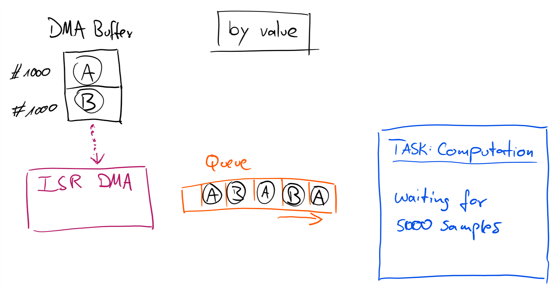 I'm continous sampling ADC values and get an interrupt all 1000 samples. These samples I am sending from the ISR via queue. To do this I have two variants: