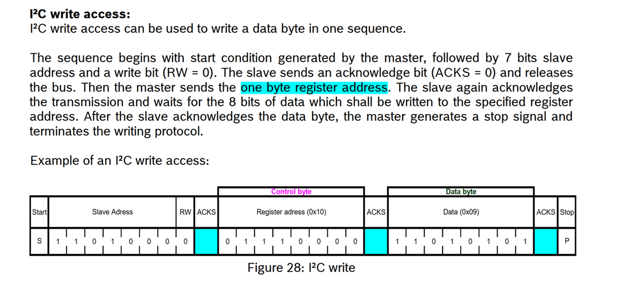 • For receiving and sending data with I2C protocol, I have defined two functions for I2C write and read. The chip I am working it, BMI160, accepts data on I2C bus like what is defined in below: