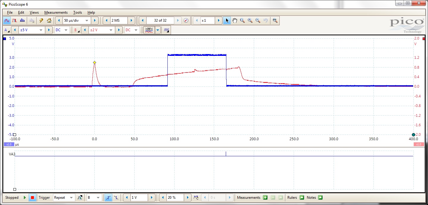 The RED line is the amplifier output which starts at the start of the timer cycle. As can be seen, the power to the amp is cut off at 182 uSecs which is the designed time. The BLUE line rises when the timer generates an interrupt at 93 uSecs, again the designed time.