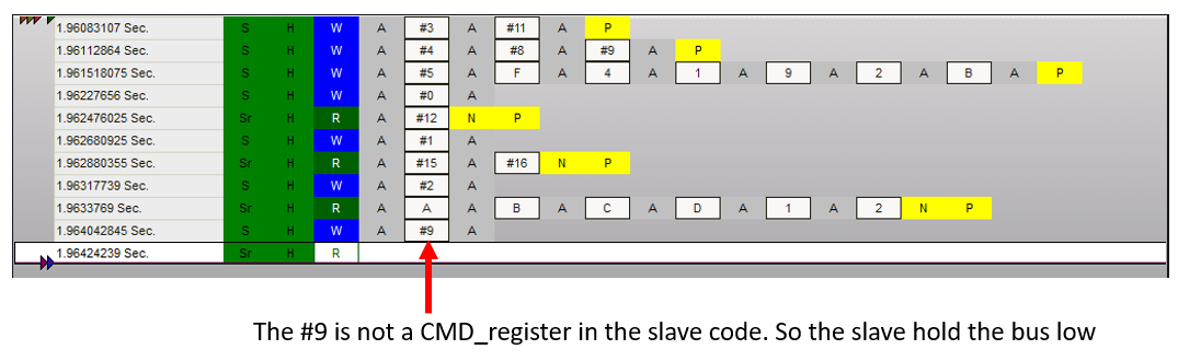 So next, I'm trying to use the master to send a master_read using a CMD_register not specified in the slave code. And then the Slave hold the bus low.