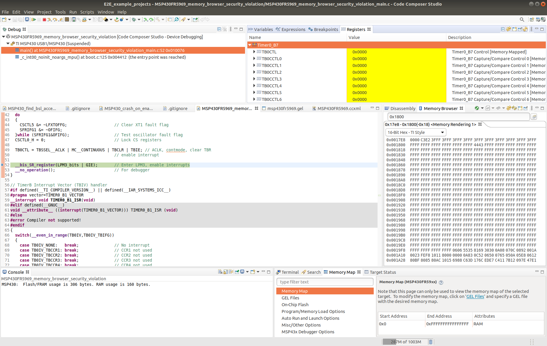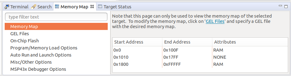 Also, the GEL_MapAddStr() and GEL_MapAdd() functions don't seem to allow specifying any addresses >= 64KB for the MSP430FR5969 with a MSPXv2 CPU, resulting in an "MSP430: Error adding memory map range: End address is beyond target memory length" error. I haven't determined how GEL determines the target memory length. For MSP CPUs the address space is 16 bits, and for MSPX and MSPXv2 CPUs is 20 bits.