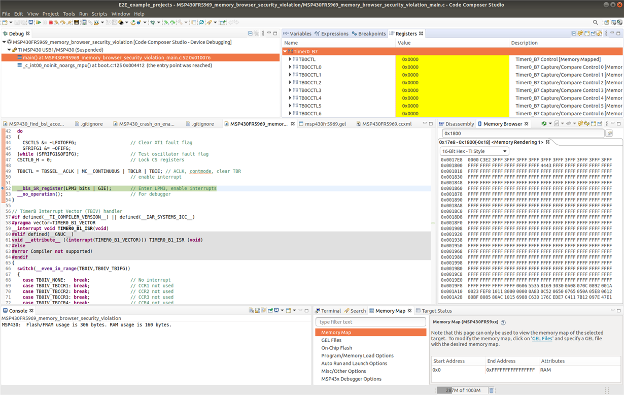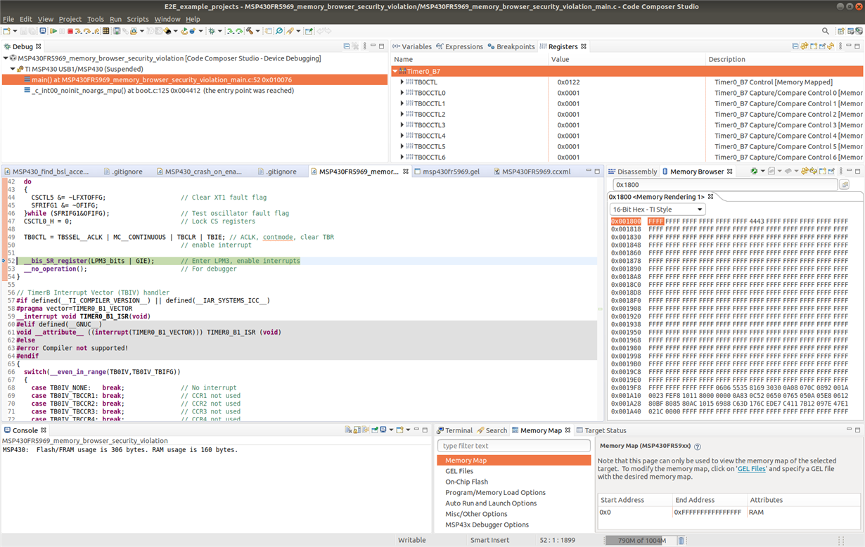 And if the CCS memory browser is used to attempt to access any protected ROM BSL address in the range 0x1010 to 0x17FF then get "----" displayed due to "Memory map prevented reading" and the debugged program no longer fails.