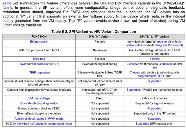 SPI interface device has two variant choices, "P" for externally supplied logic supply, and "S" for internally generated logic supply. The SPI variant offers more flexibility in device configuration and fault observability."