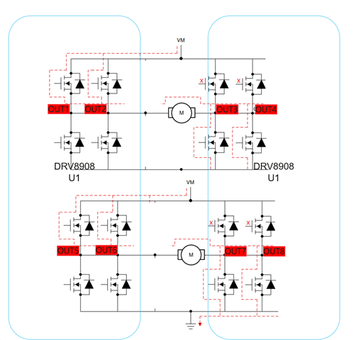 Can DRV8908 support Parallel mode like below? Two/Three/Four H bridge in parallel to drive ONE H bridge for 2/3/4A output current?