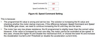 My thought is that perhaps that we do not have the best Kt constant programmed into the device, this is something we touch up on in the tuning guide I mentioned above. Which coincides with the points you brought up in your previous post (reason I was asked for Speedcommand and the Speed CmdBuffer values). If you are seeing a disconnect between your Speed Command and Speed CmdBuffer where the values of the buffer is lower than the commanded speed means your Kt values is too low for the device.