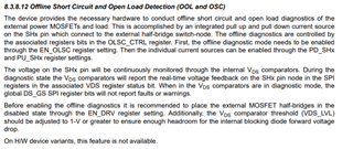 They are not sure how the function of monitoring SHx voltage and then feedback via SPI in VDS status related registers. I check the VDS status registers, their descriptions are about the overcurrent fault. If we would like to do the offline short circuit and open load detection, how the VDS_status register reflect to the each kind of fault since we only know they could refer overcurrent fault? Thank you.