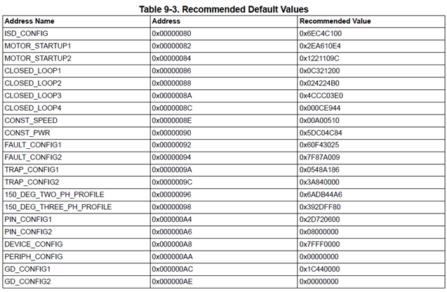 I have an MCT8316A motor driver that I'm controlling with a PIC32MM microcontroller over I2C. I'm trying to write the EEPROM with the default configuration that appears in the datasheet. The configuration is the following: