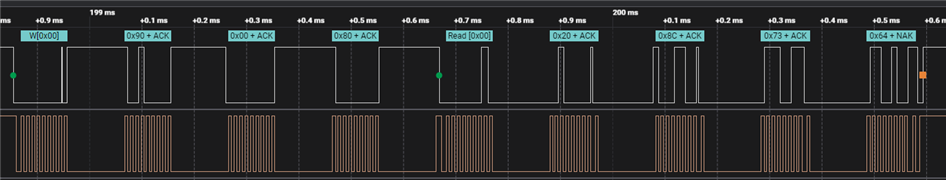 In order to read the EEPROM I write the value 0x40000000 into register 0x0000E6. This is the I2C transaction corresponding to that command: