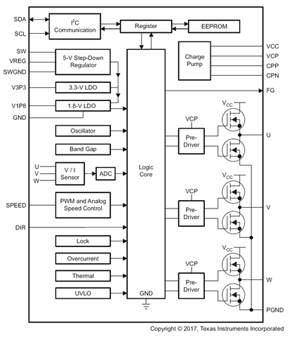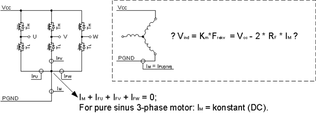 However, here I have a problem with which current is being measured. In my opinion, it is not a DC power supply. Could it be the recalculated current according to the value of the register (Reg. 0x06) (parameter "spdCmdBuffer") or is it the current passing through the currently closed (bottom) transistor of the three-phase switching bridge? The value of the current and the place where it is measured are important to me for the correct determination of the voltage drop on the winding resistance. In principle (with considerable simplification) the engine speed or the frequency of the AC voltage on the motor is given by the equation: