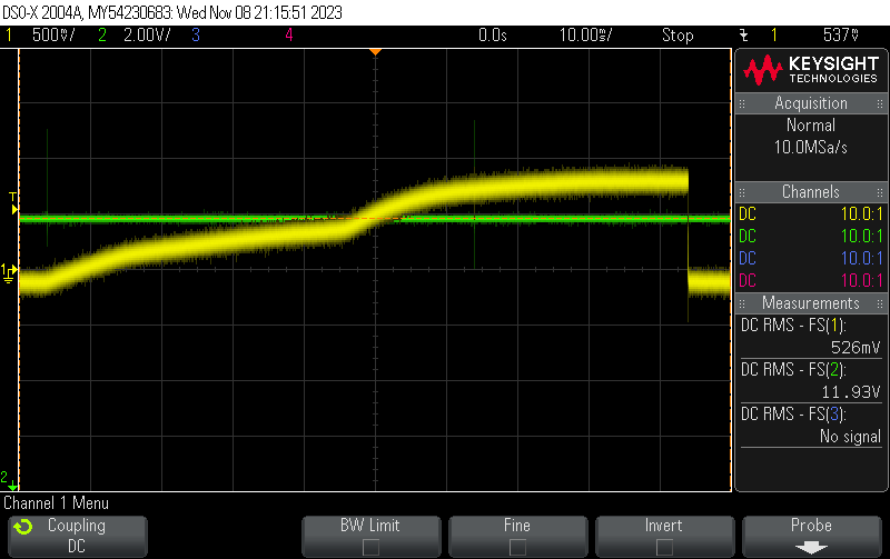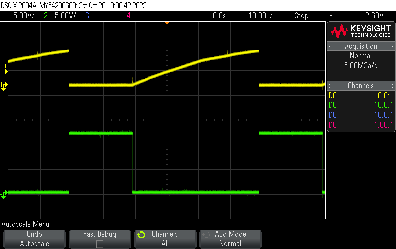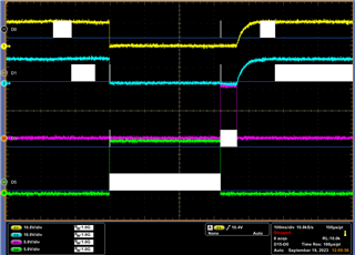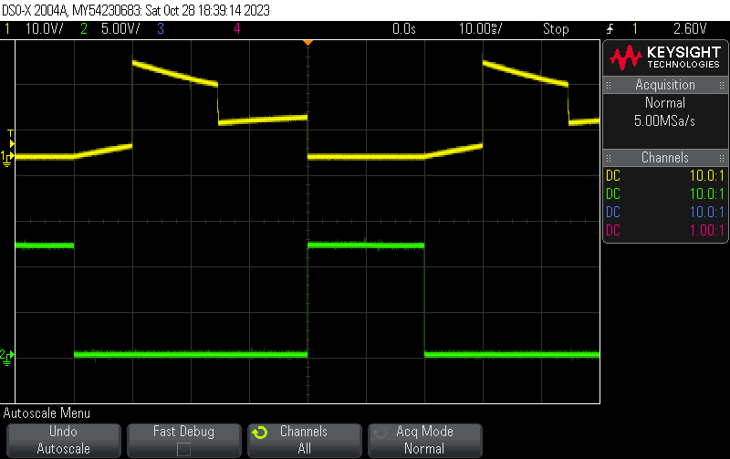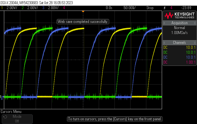 For reference, the yellow line of the screencapture represents GHA, the blue line represents GHB, the purple line represents GLA, and the green line represents GLB. Additionally, corresponding PWM signals were captured using digital channels of the scope and an offset has been applied to correspond with phases.