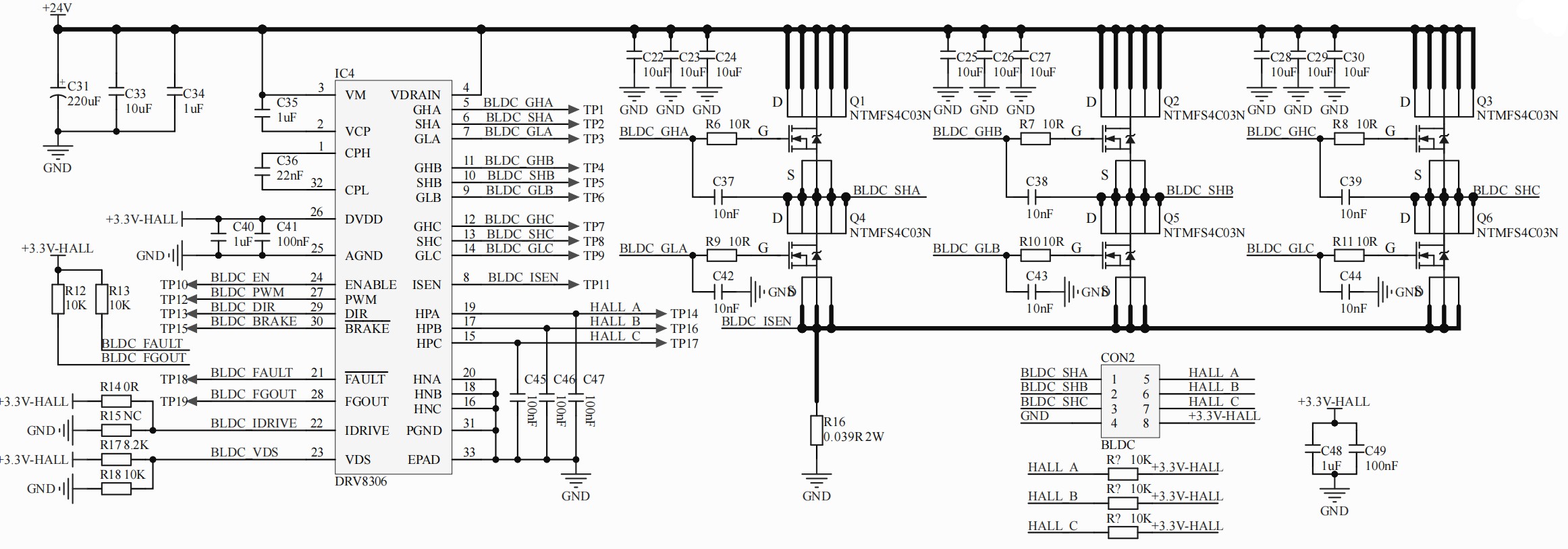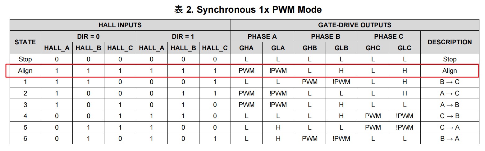 The output is always in the state of the "Align" with enable and PWM normal input. The following circuit is designed by the customer and the output state cannot be changed, regardless of the state of the Hall sensor, and is always "Align".