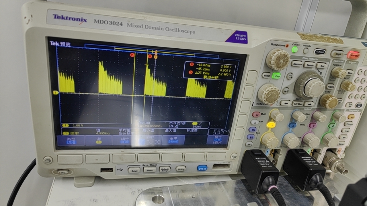 The current sampling points IPROPI1 and IPROPI2 are sampled separately during motor's forward and reverse. The voltage waveforms captured by the oscilloscope at IPROPI1 and IPROPI2 are as follows: