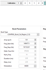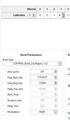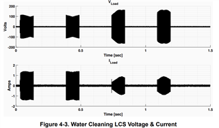 This is the voltage and current measured during a water cleaning sequence for one of our lens cover system prototypes (LCS-FL-CYL20). This water cleaning sequence has the following bursts: 8, 9, 13, 14. The frequency range for these bursts is set by running a calibration sequence with the LCS. I added images of the calibration settings below. These calibration settings are optimized for LCS-FL-CYL20. Also, the output LC filter for this LCS is 4.7nF and 22uH.