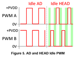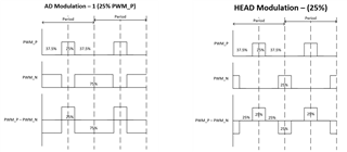 AD modulation is a common modulation scheme that essentially outputs your drive signal at a carrier frequency. The carrier frequency is 10x of the drive frequency. This can complicate the output LC filter design, so we use HEDD modulation which is a direct PWM drive that is controlled by the duty cycle (amplitude). This is also a more efficient way of driving the LCS. In this modulation scheme, the output is at the frequency of the drive signal. As you increase the amplitude to 1, the A and B outputs reach a 50% duty cycle.