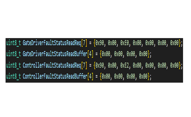 - To read the GATE_DRIVER_FAULT_STATUS register (0xE0), I created and sent the GateDriverFaultStatusReadReq buffer as shown in the attached image.