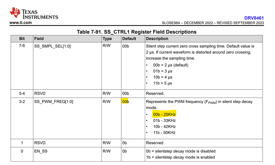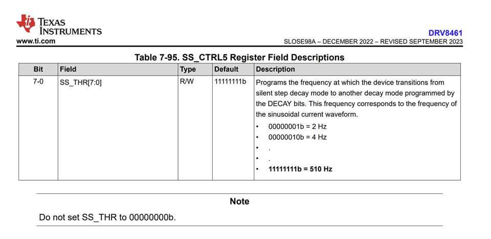 With this formula: fSTEP = (SS_THR * 1000 * usm) / 256 fSTEP is 10240 at highest speed and usm is 256, so SS_THR should be 10Hz?