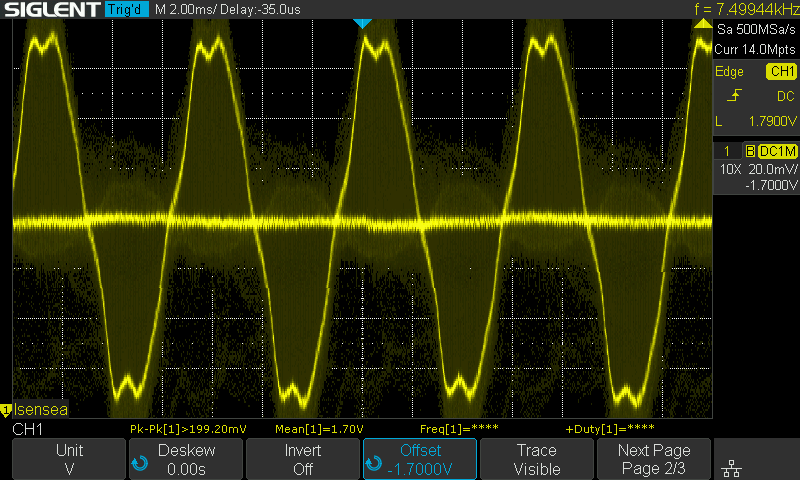 Phase A current (voltage drop across shunt resistor R4 for Phase A. amplified and sent out to the launchxl on ISENSEA pin) during identification of RampUp: