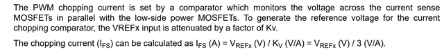That said, you wanted to not have any current chopping. What is the load current expected? There is no way to disable current chopping but setting the VREFx above the maximum load current will result with no chopping. When VREFx = 3 V, the MAX recommended value, current chopping will happen at 1 A as per the calculation. With 1.8 V VREFx the chopping limit would be 600 mA. For load current < 600 mA there will be no current chopping. Thank you.