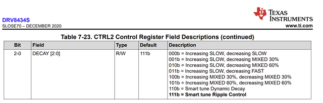 2. The datasheet on page 11 says "The DRV8434S comes with smart tune decay modes". Would you please tell me how to find which decay mode is performed at a certain moment if there is? Would it be found by checking the DECAY[2:0] in CTRL2 control register?