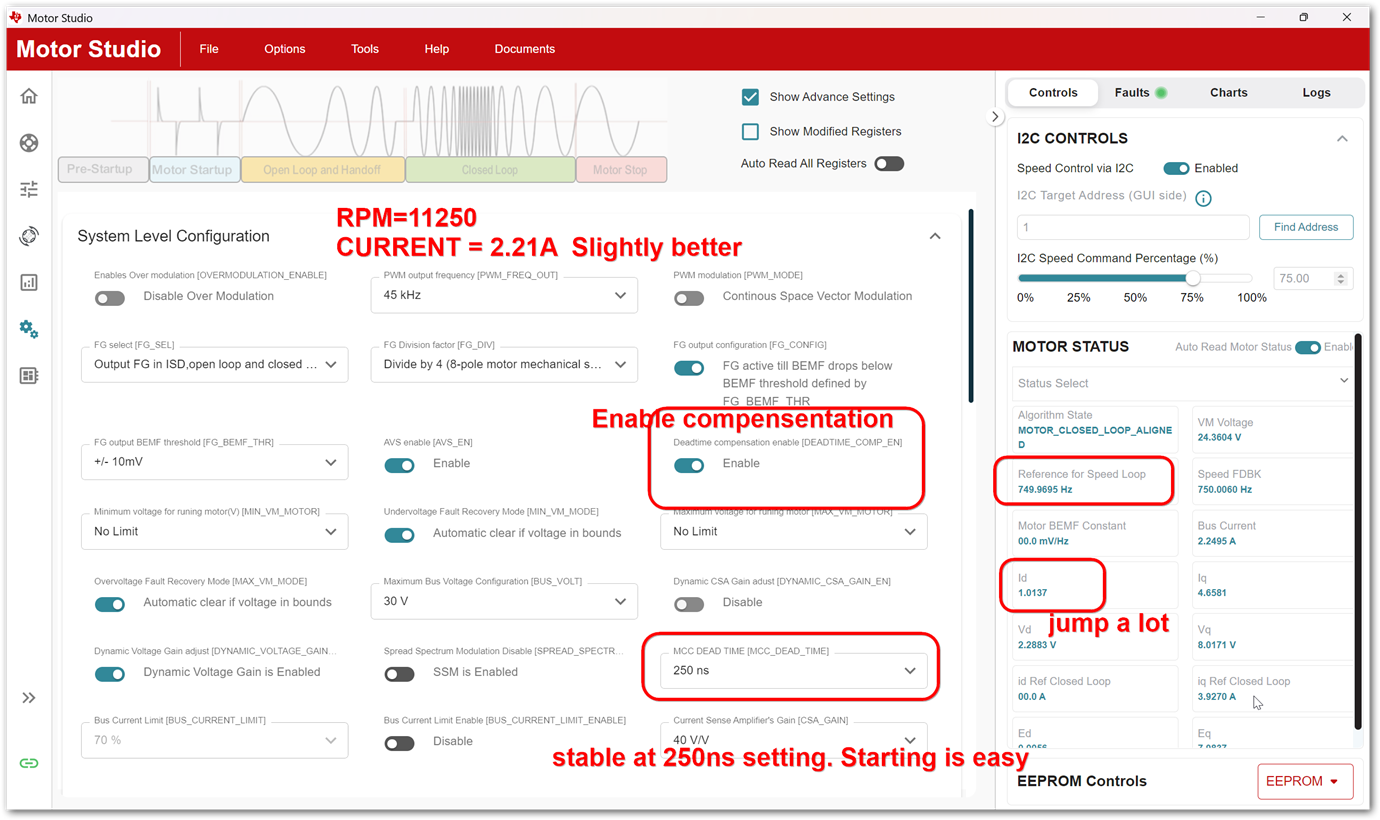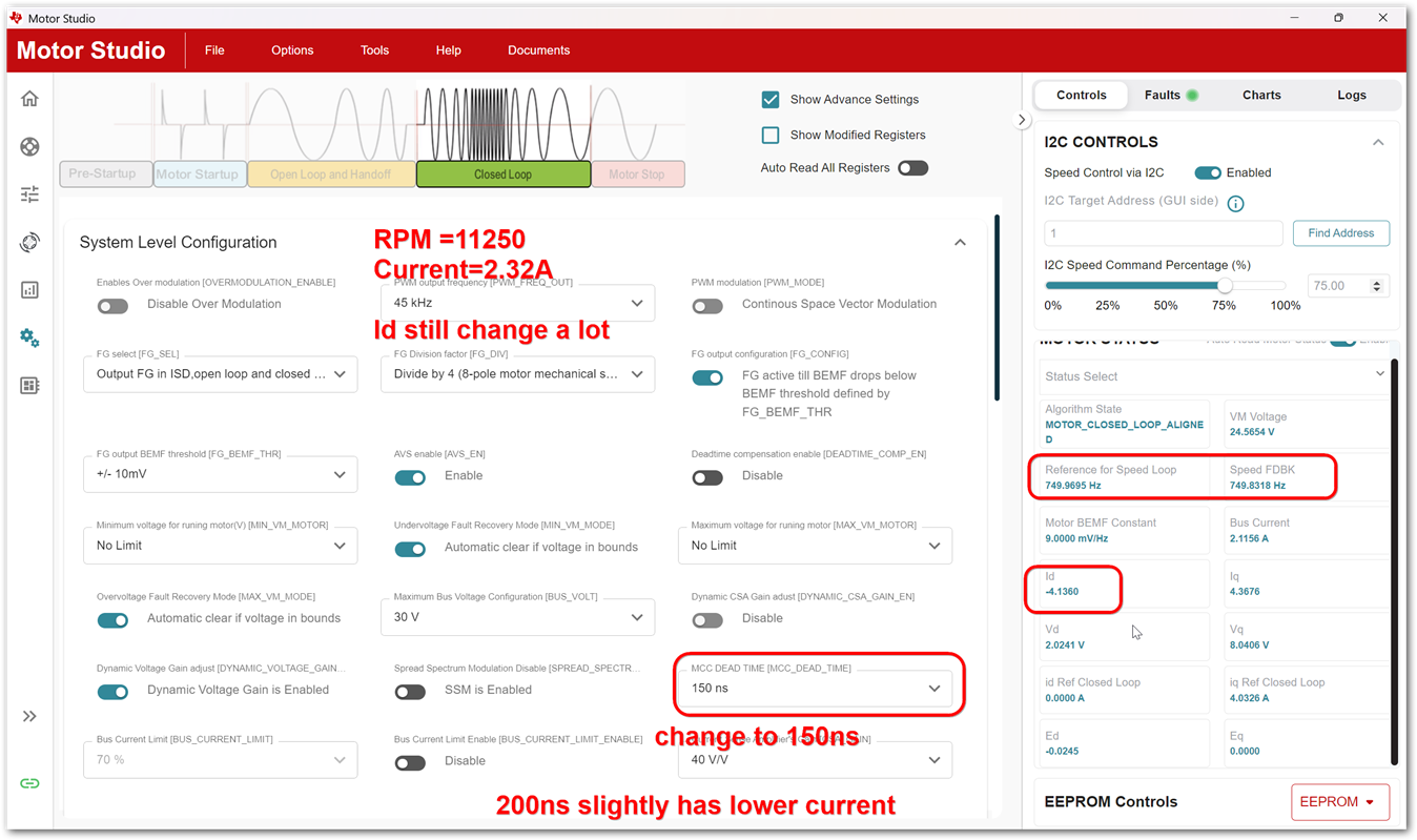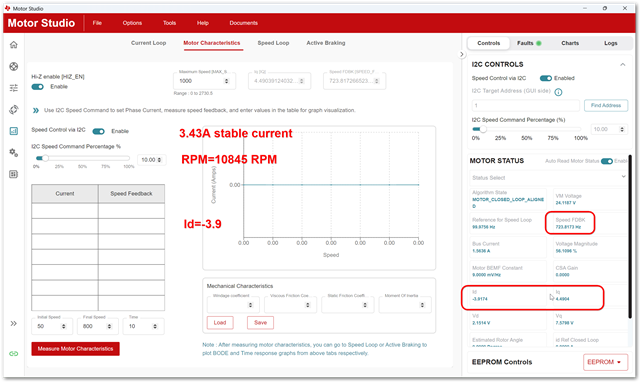 Then i switch to I2C speed control, I can run the motor at 11000rpm. The current from power supply is about 3.43A, The bus current shown in the figure is only 1.6A. Don't understand the exact meaning.