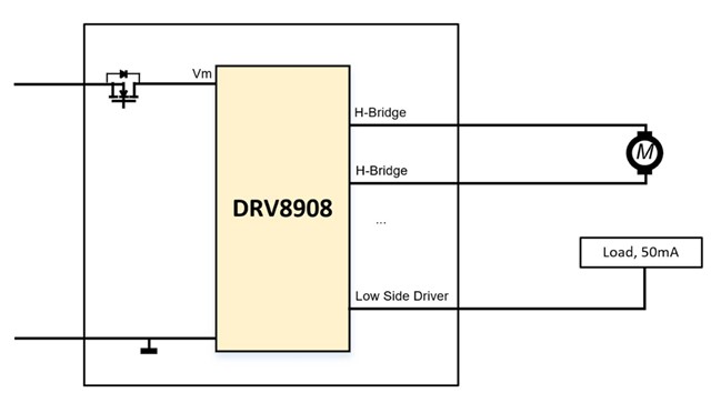 In one design consideration, my customer would like to use DRV8908 for not just small actuator motors, but also as a low side driver for 50mA load. See the diagram below.
