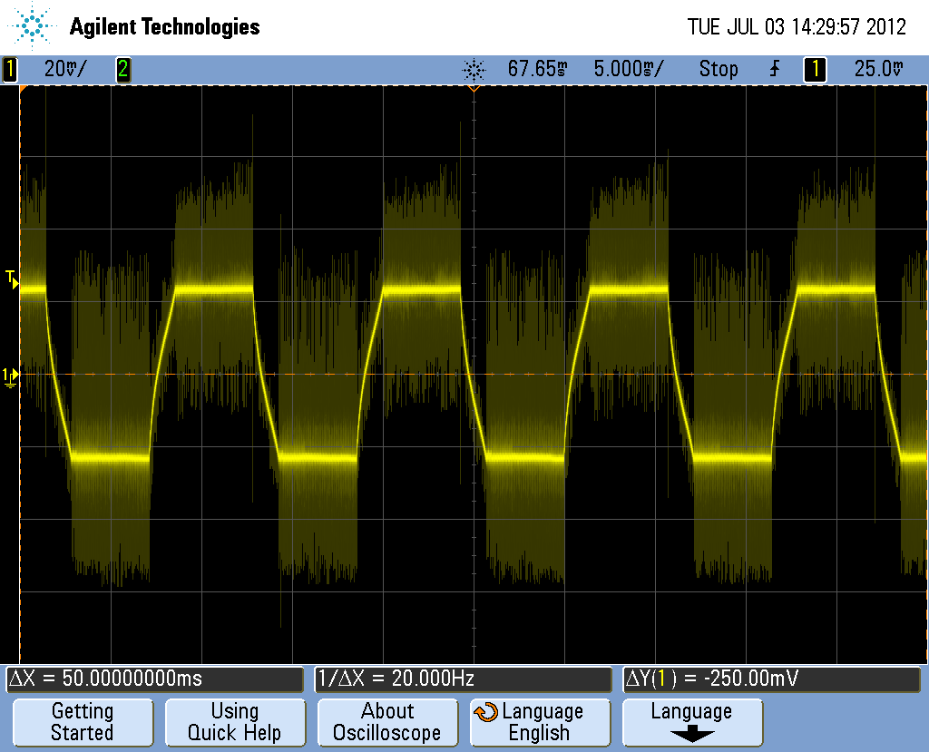 We designed a circuit which we can run two Double stack stepper motors using DRV8821. Without current limit for short duration we have not seen any noise on the current waveform. After that we chopped our circuit to 1.32A by adding 0.5Ohm resistor. But now my current waveform is having much high frequency noice. Can anyone suggest why it so??How to reduce it ?? Kindly help me out to get pure current waveform.