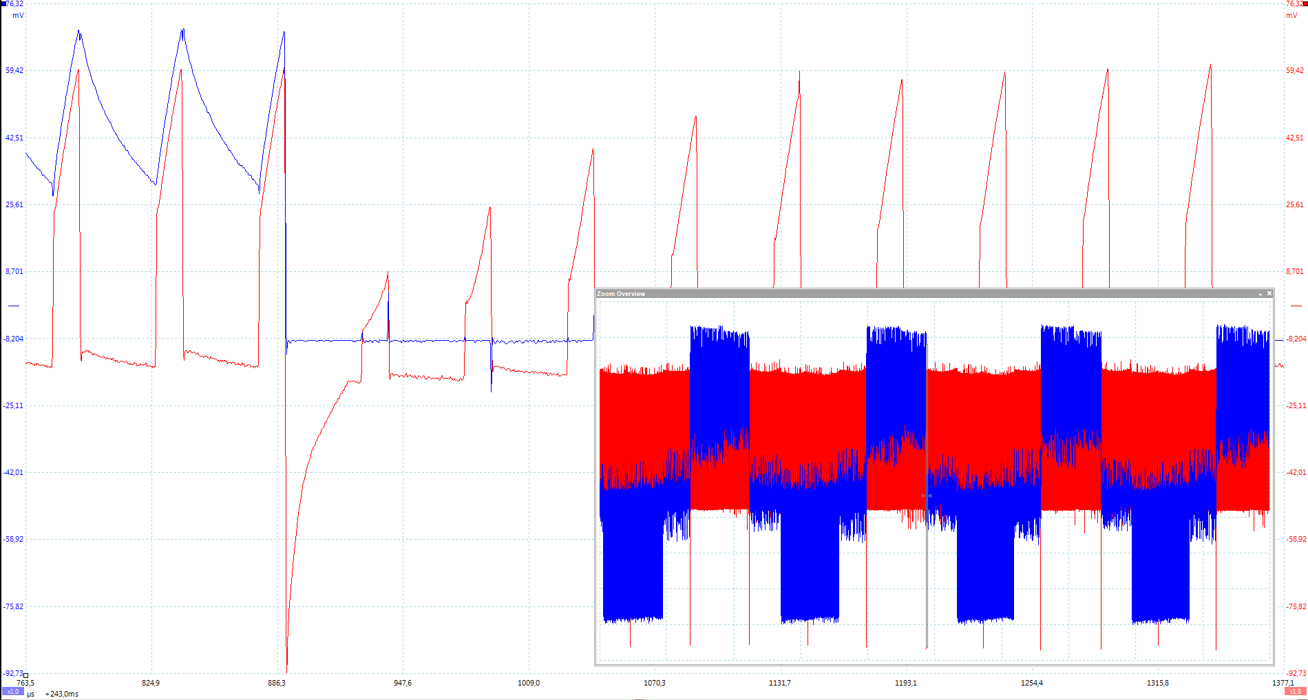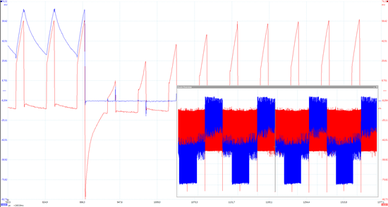 Hi, We're working on a project involving control of a BLDC from Faulhaber (3564) with rather low inductance. When loading the motor (sensored, velocity control) a ticking sound appears. I tried to take a closer look at the phases with a scope and caught the following (figure attached):