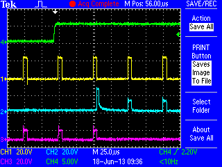 It shows Hall C (green) and the three phases (A yellow, B blue, C magenta). When switching commutation state, phase B alone is on for a short while. It doesn't look right and I wonder if this could be the cause of the noise? And what can I do about it? The same behavior is seen with the BLDC-Sensored example project.