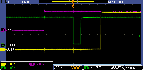 Everytime I switch, the FAULTn signal is asserted for 6 us and this occurs 43 us after IN1 or IN2 is asserted. It doesn't matter if the solenoid is connected to the board or not. The power supply is stable at 5.0 V and the DRV8832 is decoupled with 100 nF. Vref and Vset is connected together. Iref is connected to gnd. FAULTn is pulled up with 1kohm.