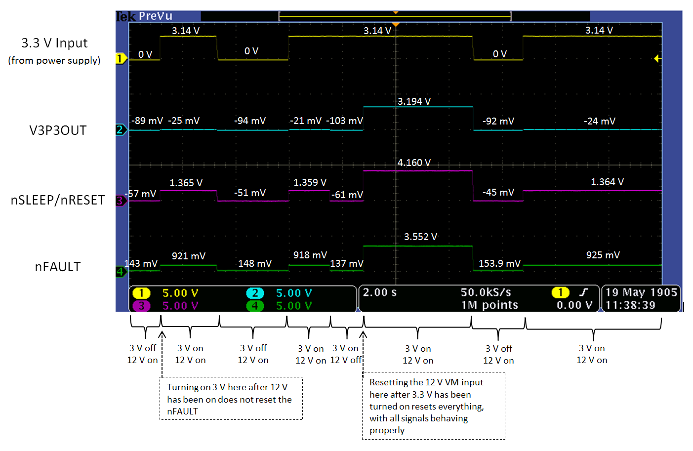 A power up in the reverse order, 3.3V then 12V, results in proper functioning of all components.