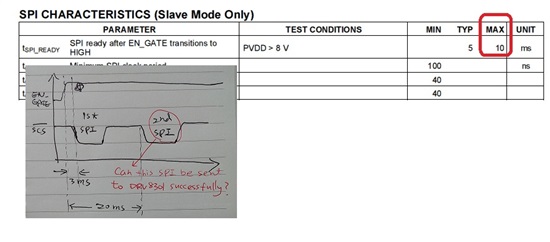 Just like to double confirm one thing for DRV8301 SPI. Please refer to the attached picture. Based on the datasheet, MCU cannot send any SPI command to DRV8301 successfully if T_SPI_RAEDY > 10 ms. So the 2nd SPI cannot be sent to DRV8301 successfully. Is it true ??