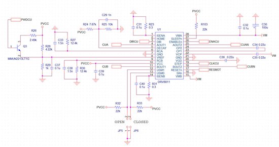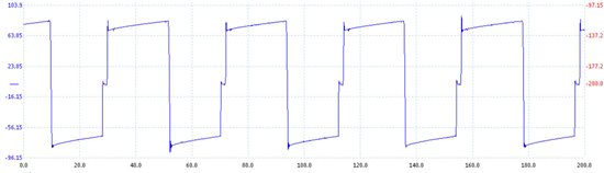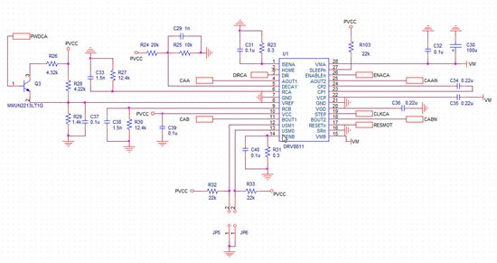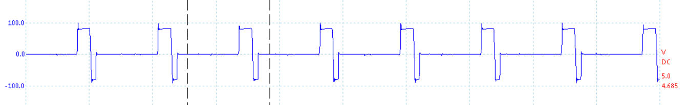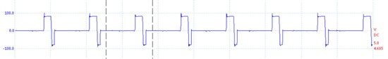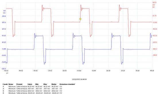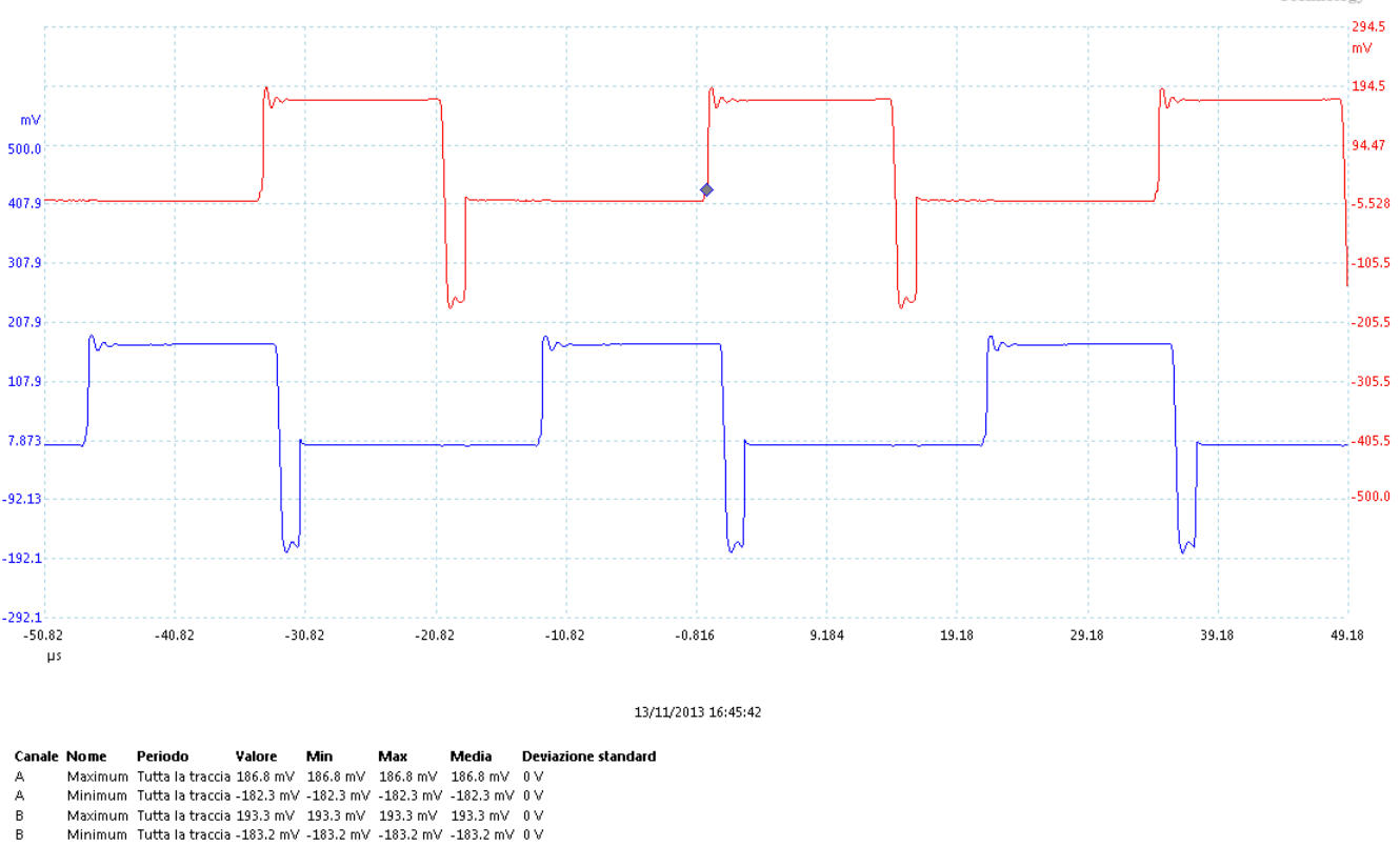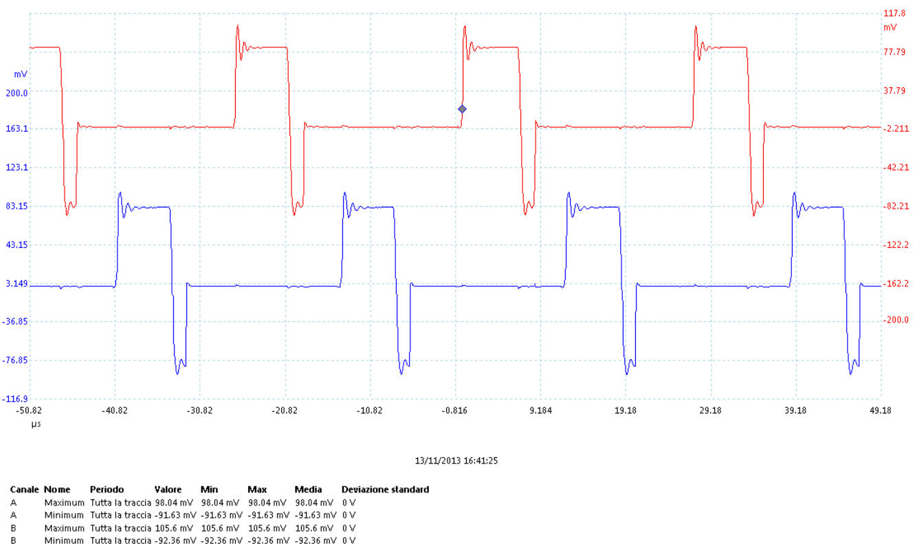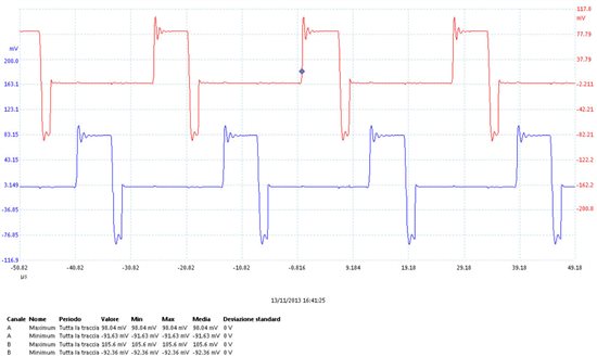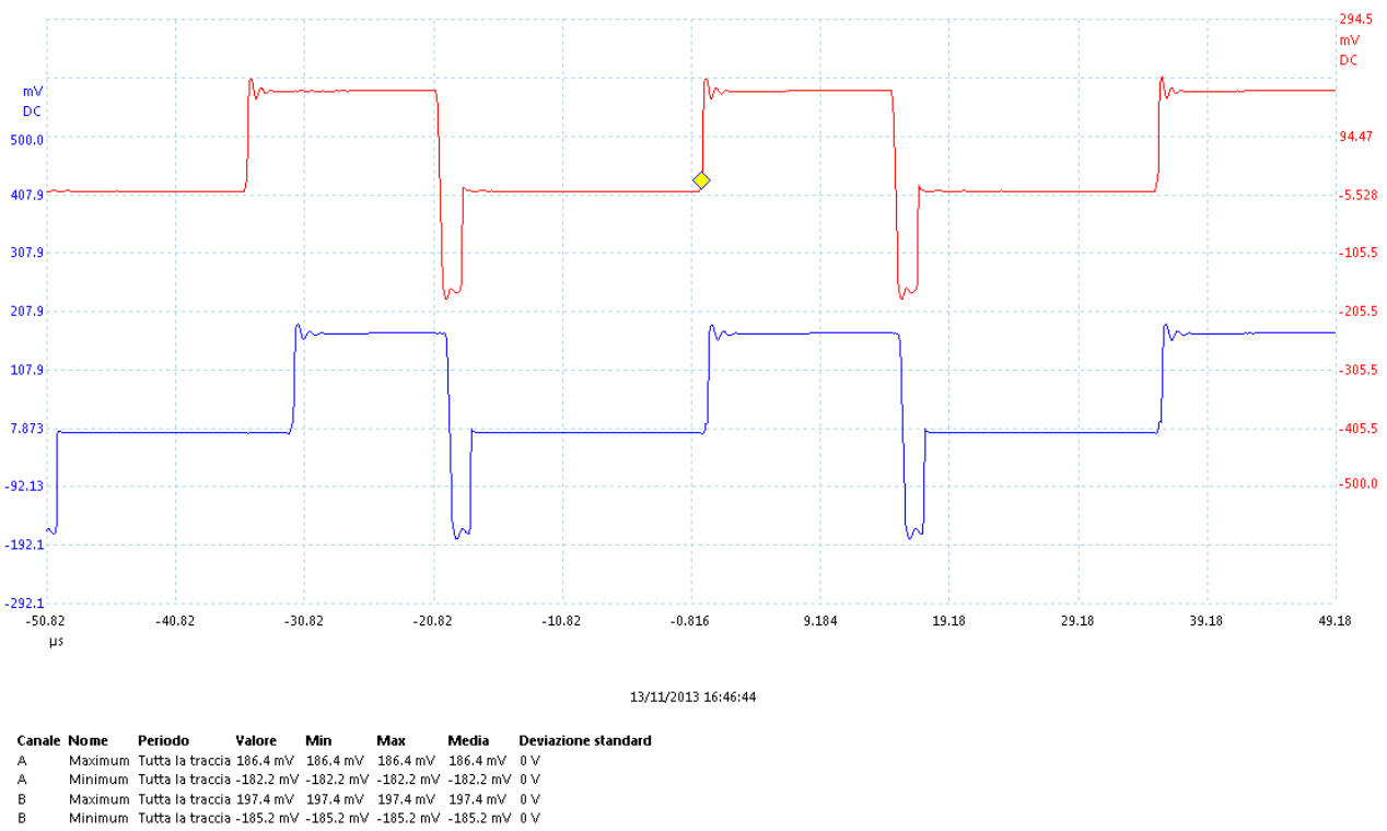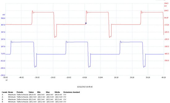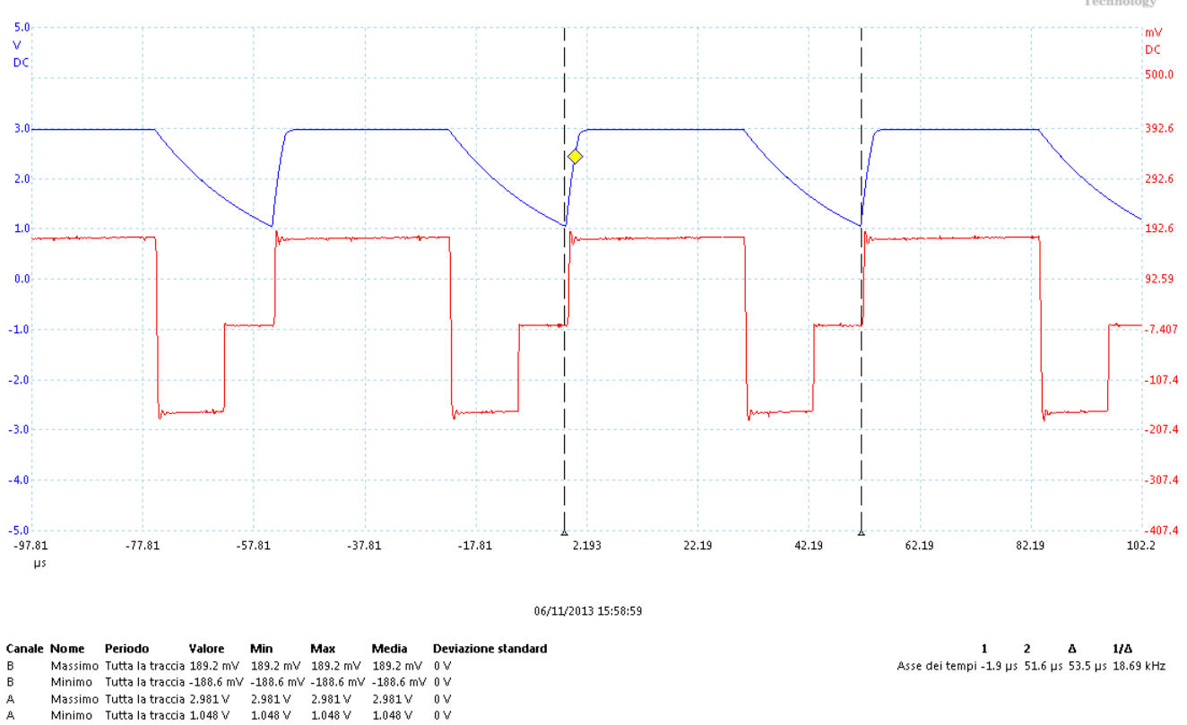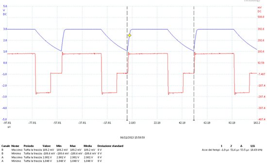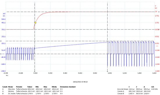 the following picture shows the voltage waves form on pin 1 (red trace) and on pin 6 (blue trace) of U1 when PWDCA is 5V, VREF=1.98V and Ichop=0.83A;