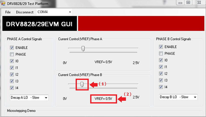 Once we start the Microsteppering Demo control, all the ENABLE, PHASE, (Ix are exclude), Decay, VREFx are taken over by the DAC-VREFx-PHASE micro-stepping algorithm. In this algorithm (Please refer to http://www.ti.com/lit/an/slva443/slva443.pdf ), VREFx are fed with fixed range sinewave voltage from the DAC. When the motor is running and controlled by the bottom side GUI function, any change on the upper side will still affect the outputs (I should correct my last saying that they are independently). Some parameters are continously updating in the micro-stepping algorithm, such as the VREFx voltage and PHASE and DECAY, so your mannully change on the slider in upper GUI will only take a transient effect because it will be override soon. But some IO can disturb the microstepping totally, such as ENABLE and Ix.