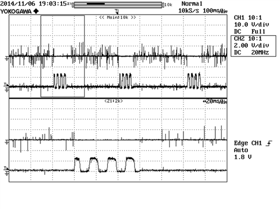 At IOUT=1.4A following switching phenomena were produced by DRV8816.