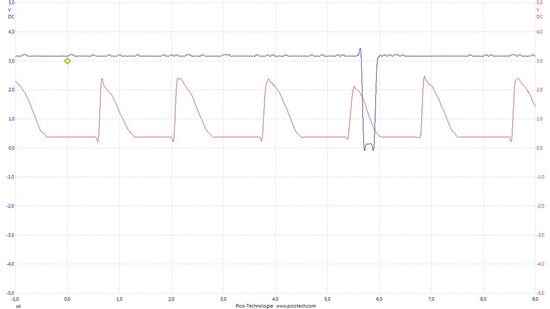 The microcontroller sends perfect signals at 38kHz (90%) to the DVR8312 PWM_A. PWM_B is low and Reset_B is high, so lowside should provide a ground path. However, OUT_A just goes into "Bootstrap Capacitor Under Voltage Protection", I think. The current through the motor is rather low, just a few Milliamps. The voltage at the bootstrap pins peaks up to 33V, which should be perfectly ok.