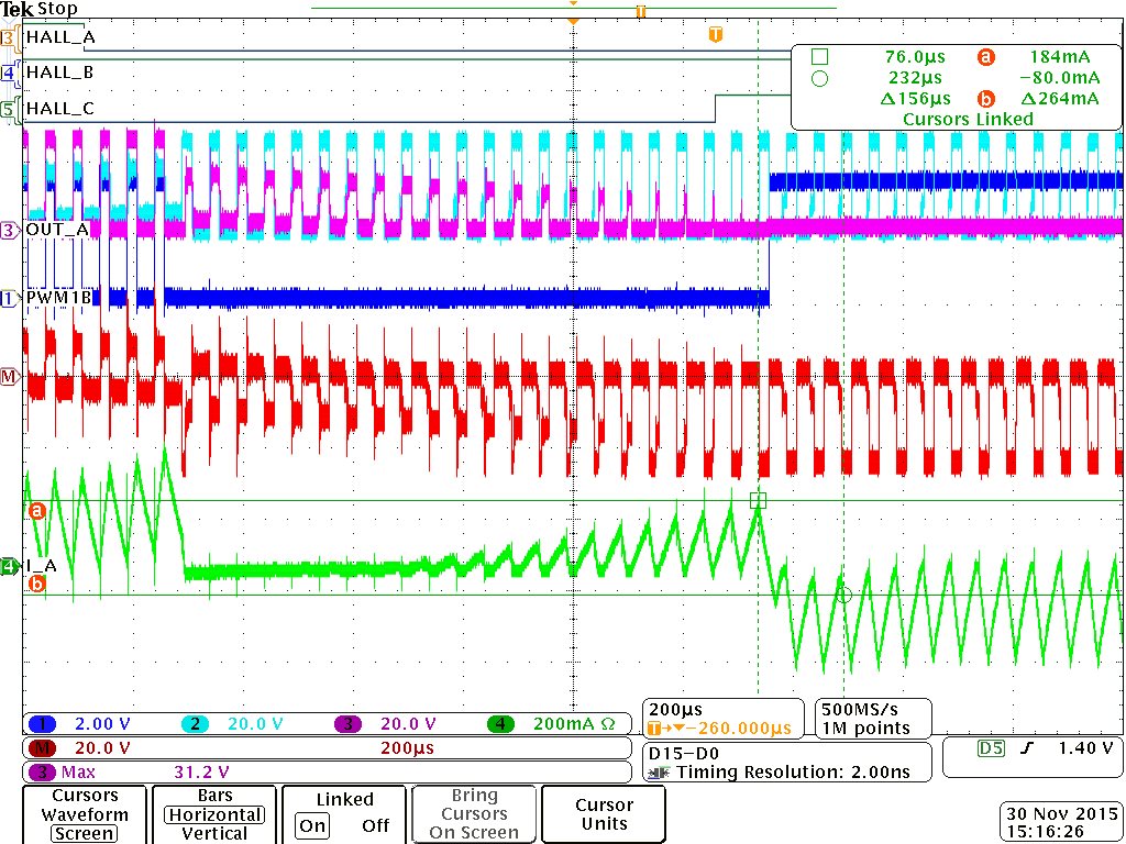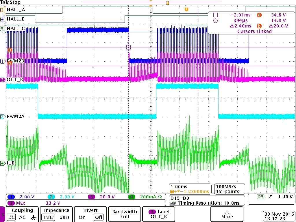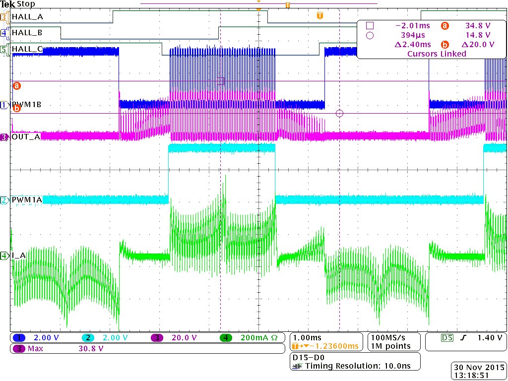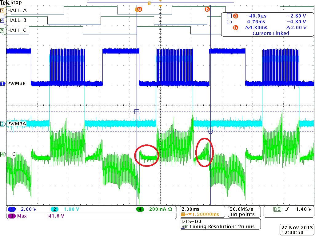 Any idea, why current still flows on the red circled areas? Technically, at those instances, the current should flow on the high and low side FET (i.e. high-impedance state). Hence, in those areas, it should just be a flat 0 A level. The green curve is the current measured on phase C of the motor that came with the kit.