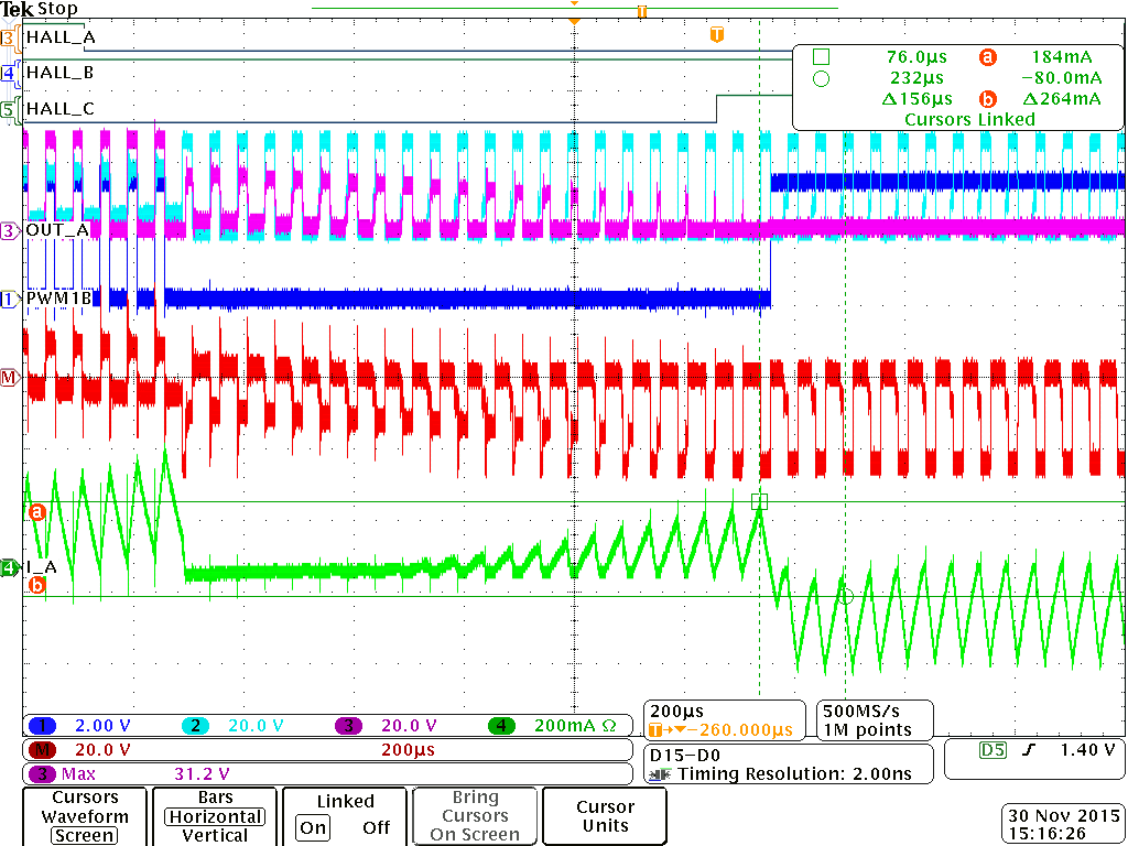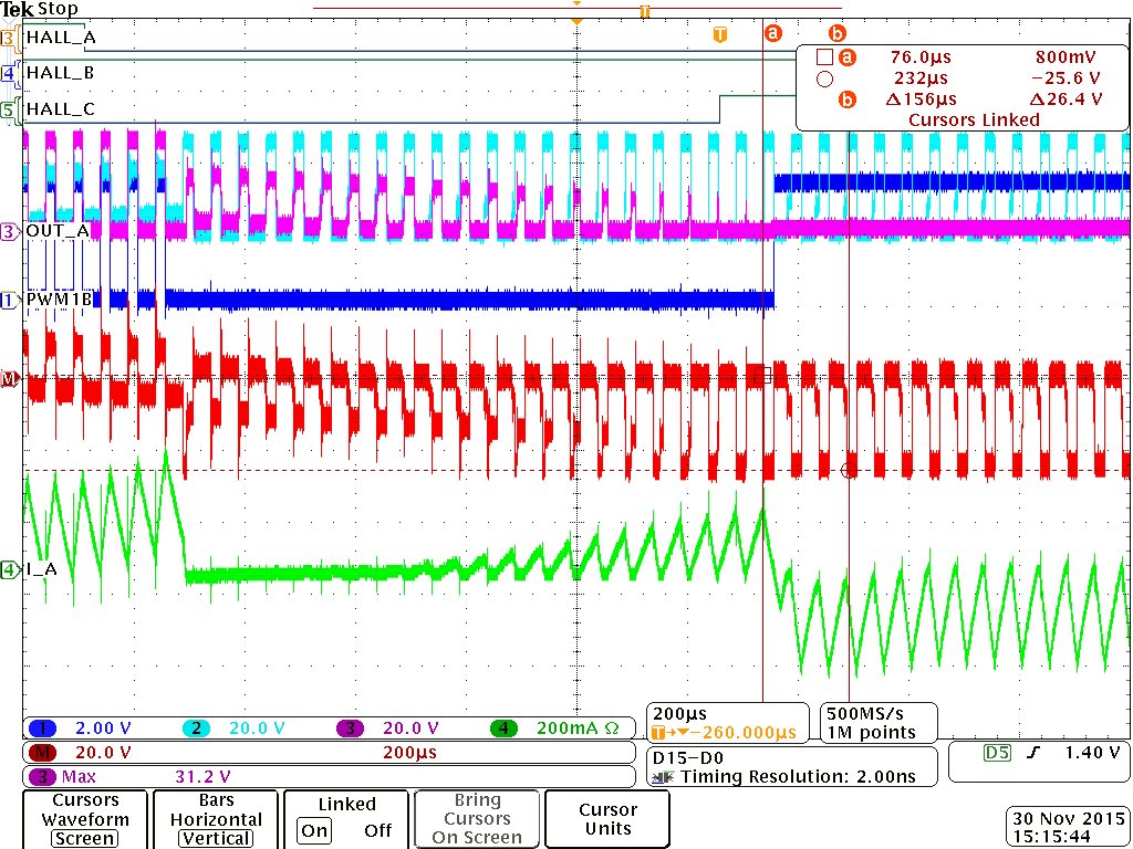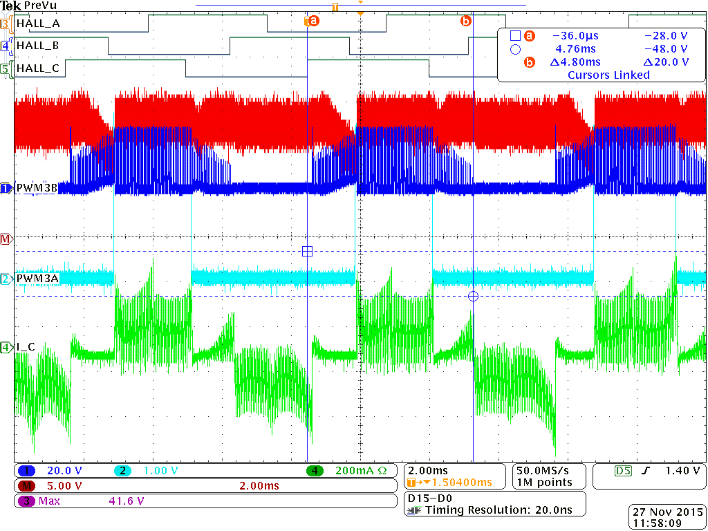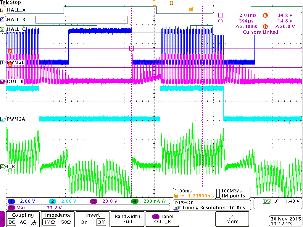 Any idea, why current still flows on the red circled areas? Technically, at those instances, the current should flow on the high and low side FET (i.e. high-impedance state). Hence, in those areas, it should just be a flat 0 A level. The green curve is the current measured on phase C of the motor that came with the kit.