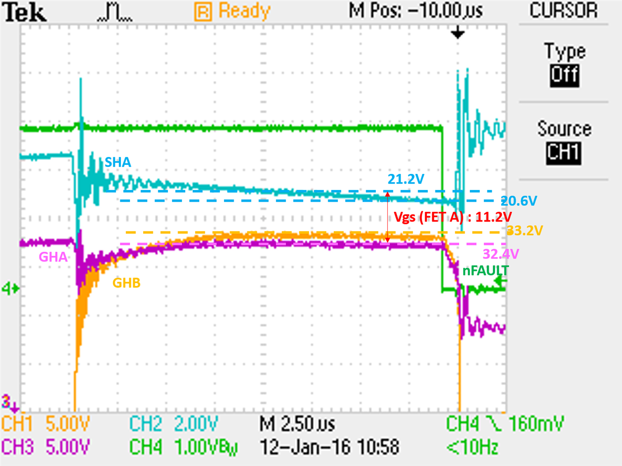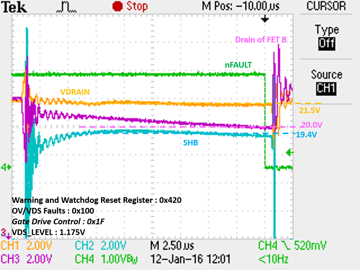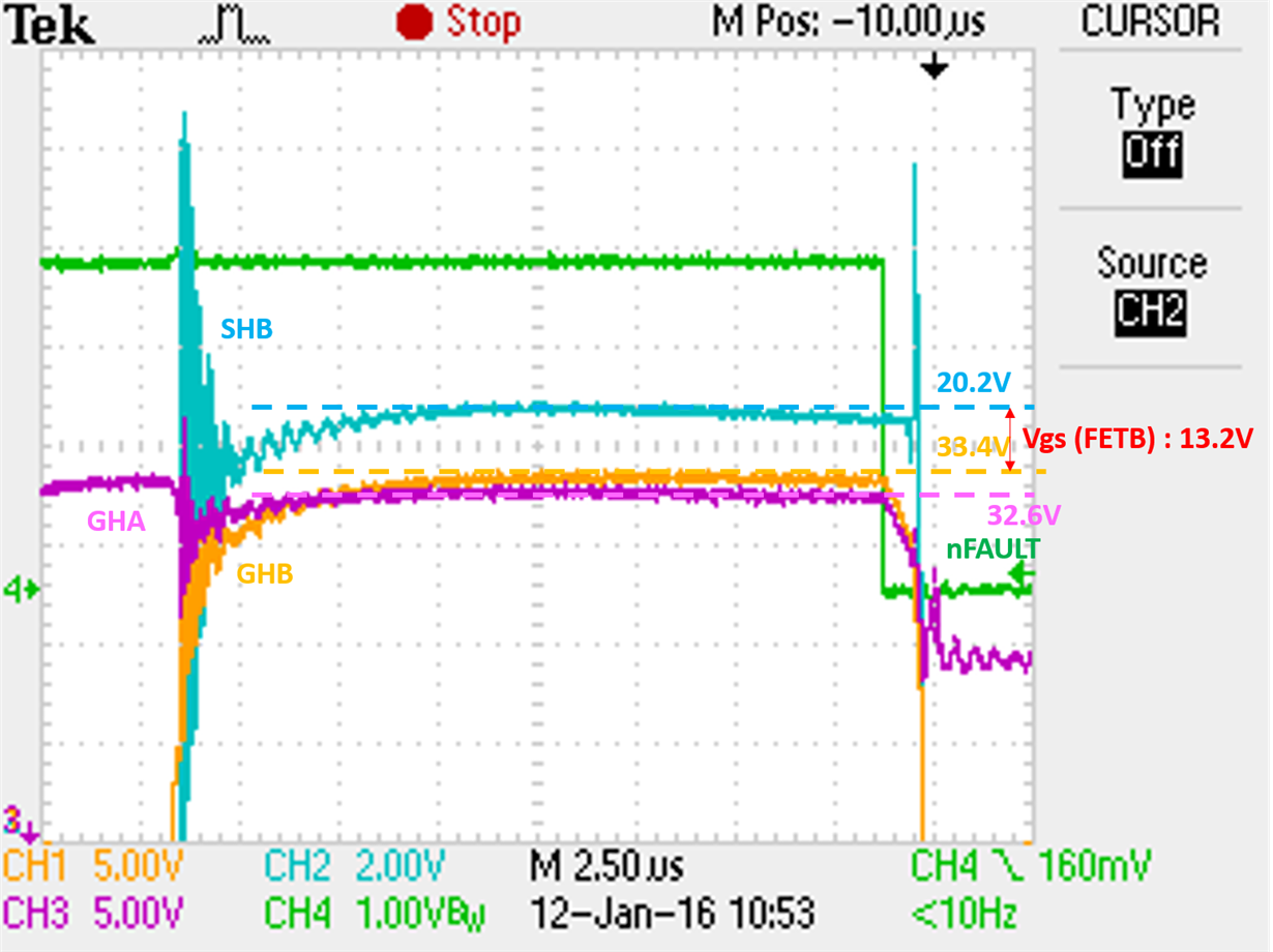In the result, rate of VDS monitor fault is decreased but VDS monitor fault for only high side FET B sometimes occurs with the following waveform.