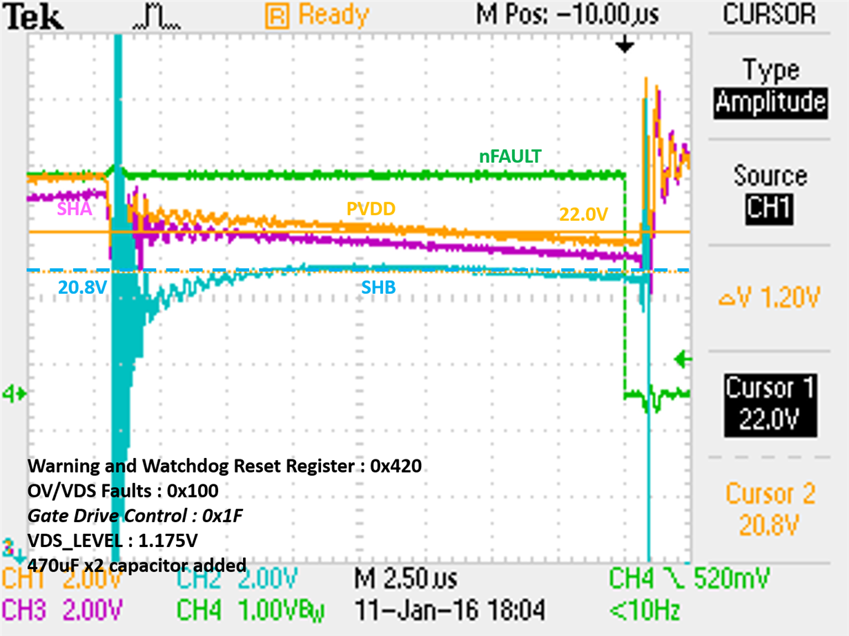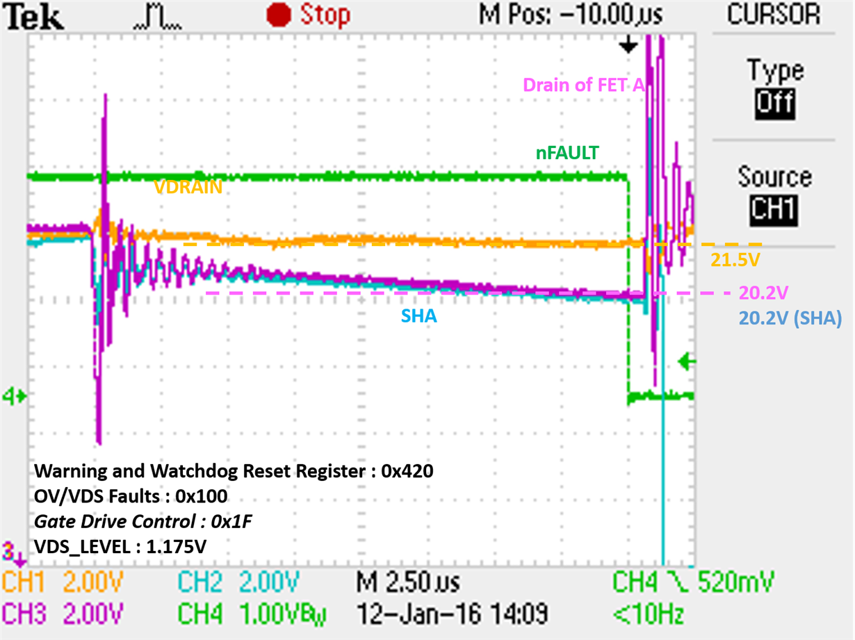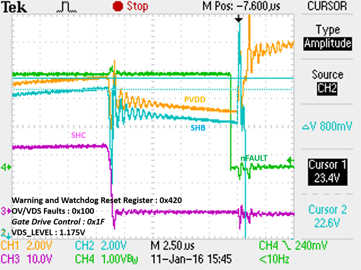 In the result, rate of VDS monitor fault is decreased but VDS monitor fault for only high side FET B sometimes occurs with the following waveform.
