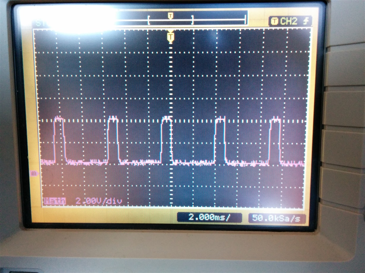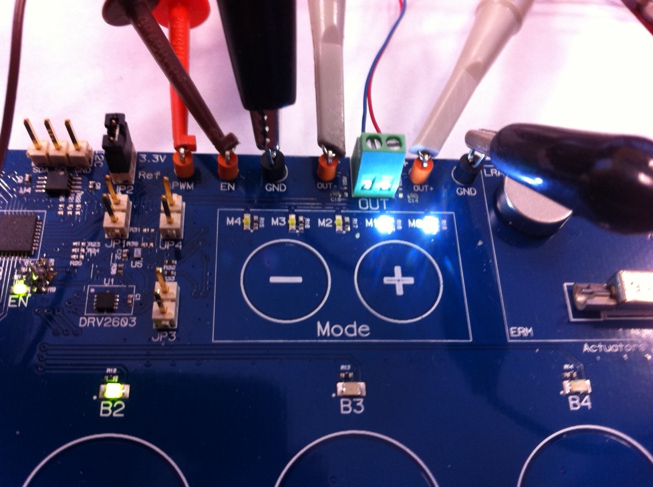 Using binary counting Mode 5 (LEDs: 00101), I press button B2 to Enable the DRV2603. The external enable signal works correctly; when I toggle it on and off, the LRA turns on and off. However, I supply an external PWM signal and no matter what the signal looks like (0% to 100%), the signal driving the LRA doesn’t change (measured by oscilloscope attached to OUT- and OUT+). I have removed the JP1 jumper. My PWM signal is 3.3v and 10kHz frequency and the board is powered with 5v from a USB connection. This seems to be OK given what I read in the datasheet [External PWM Voltage, VPWM' (optional): 1.8V to VDD]. I manually change the external PWM (from 0% to 100%), confirmed with oscilloscope reading, and the signal to the LRA doesn’t change. I also tried using a high and low signal as the external PWM to simulate 0% and 100% PWM but the LRA vibration does not change.
