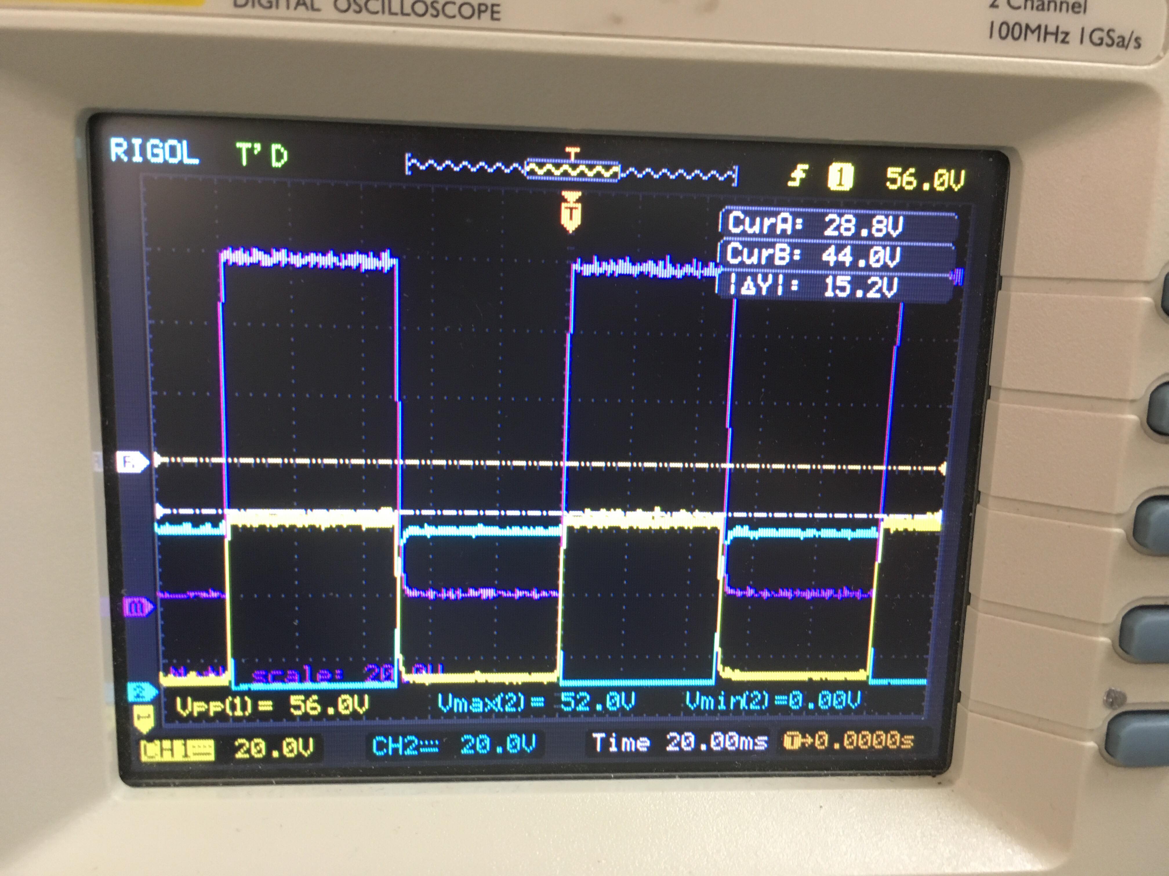 The yellow curve represents the signals of Ch1, while the blue curve represents the signals of Ch2.Both the signals show square wave with peak to peak voltage of 50V. The purple curve is the difference of signals in Ch1 and Ch2, revealing a square wave with peak to peak voltage of 100V (50X amplification rate).