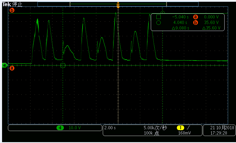 2. When the system was power-off, using hand to rotate the BDC, it got 35V peak induced EMF and the device broke down (VM-GND impedance is 0) . test points were OUT1/OUT2 - GND, waveform as below.