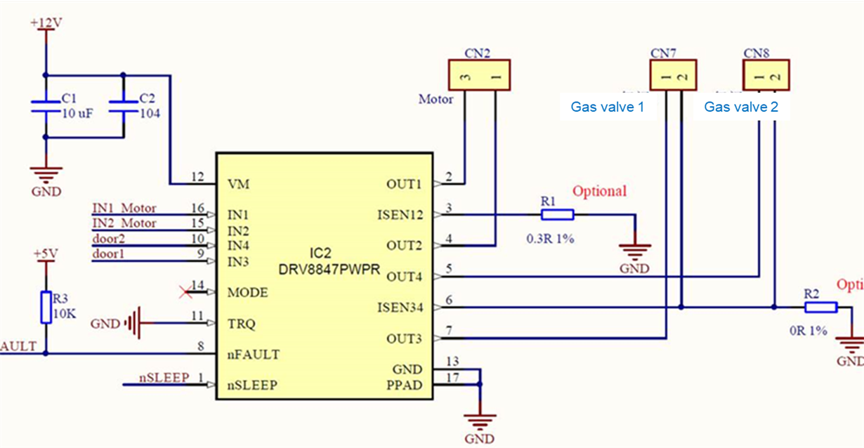 1. DRV8847 is used to drive a BDC and two air valve with independent H bridge as below.